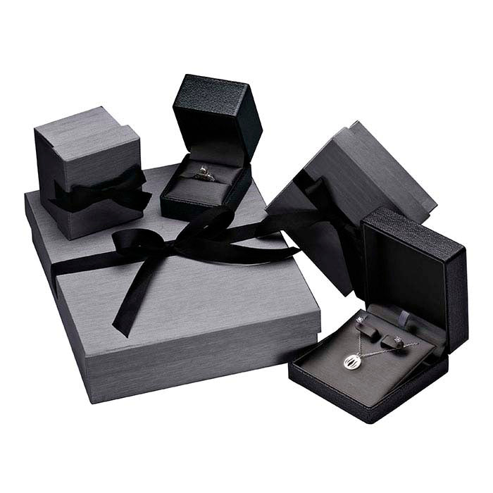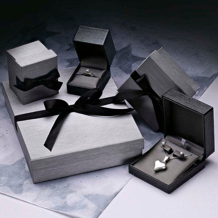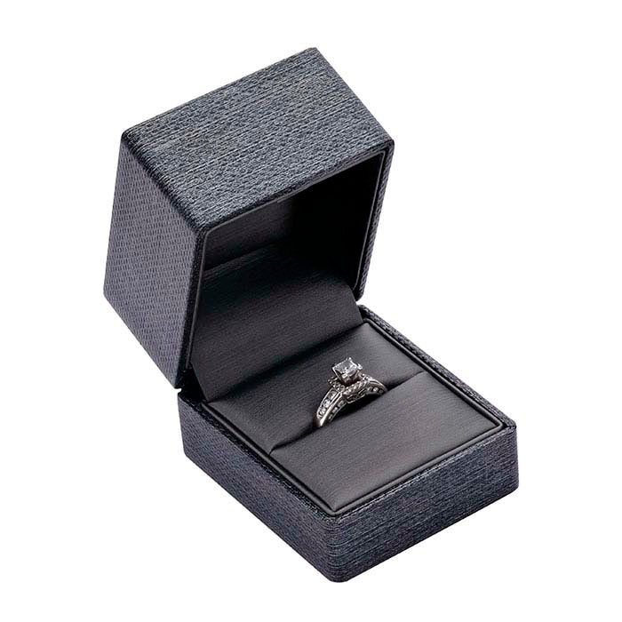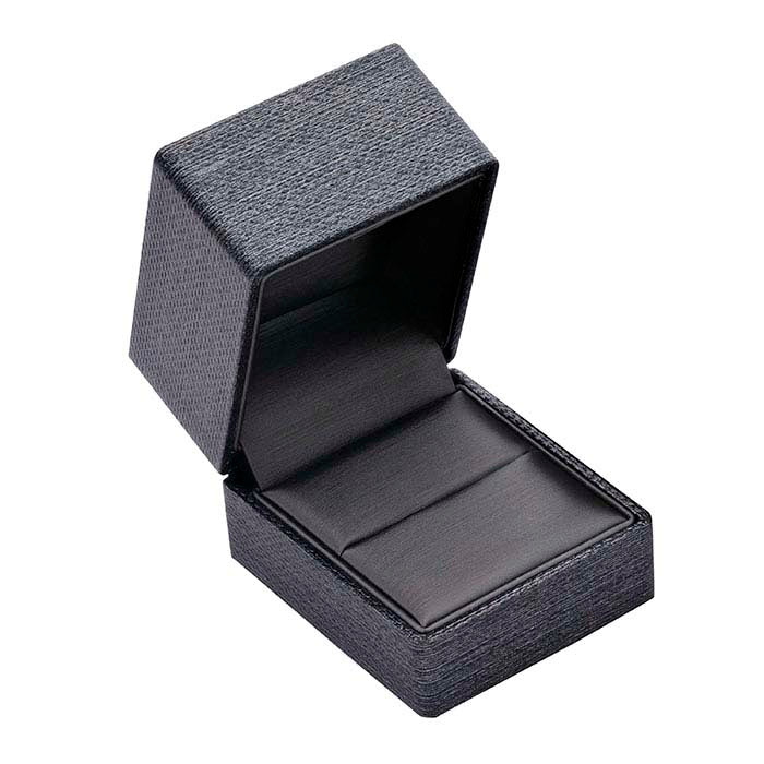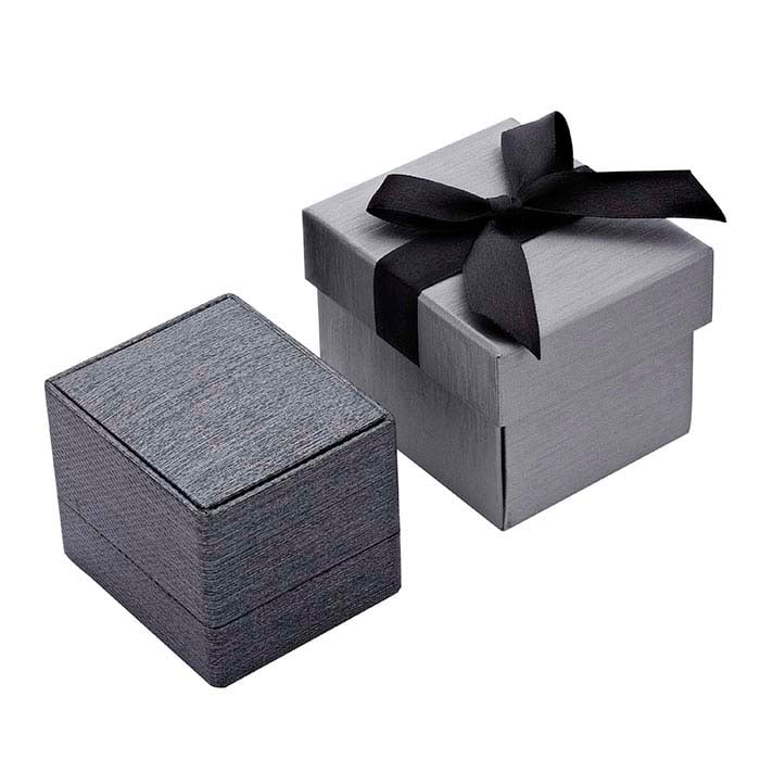 קופסת טבעות צירית פרימיום "Silver Night" בצבע אפור-מתכתי, אידיאלית להצגת טבעת גבוהה ומדגישה את התכשיט שבתוכה. אריזת שני חלקים בצד נופל עם מרקם מוברש ואפור בהיר, כוללת סרט וקישוט קבועים לצמיתות ואינה דורשת קישוט נוסף, מה שהופך אותה לאופציה נוחה וחוסכת זמן לאריזה. נייר אפור עם מרקם אבנים ומבריק מתכתי מכסה את הקופסה מפלסטיק; עור מלאכותי אפור מרפד את פנים הקופסה ומכסה את הציר ואת המילוי המרופד.
