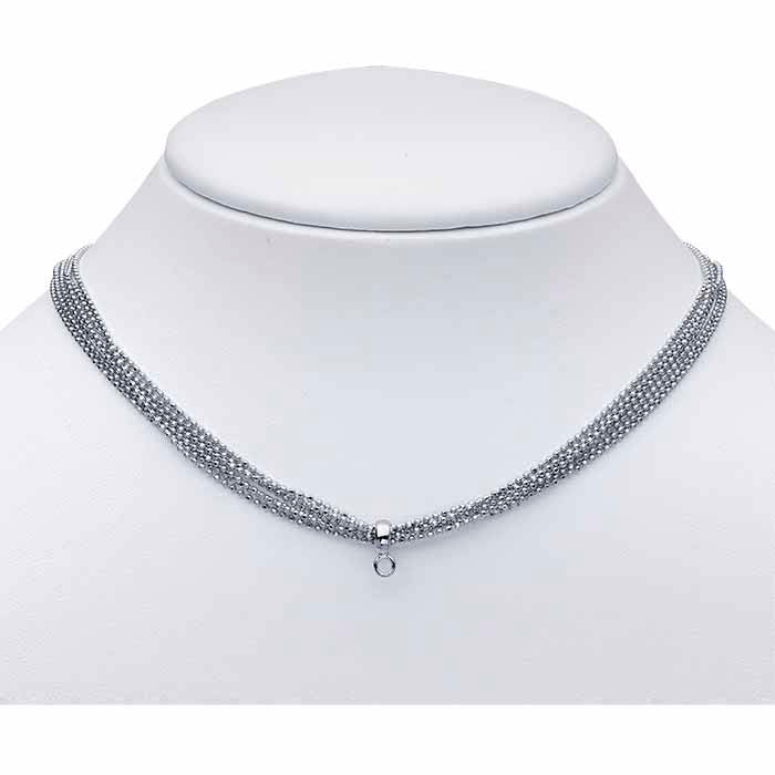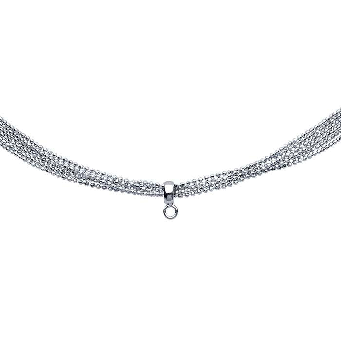 שרשרת צ'וקר מכסף סטרלינג זו כוללת שישה גדילים של שרשרת חרוזים בגימור יהלום בקוטר 1.1 מ"מ, הלוכדת אור. תליון סליידר מבריק נע בחופשיות לאורך כל אורך שרשרת החרוזים וכולל טבעת סגורה (קוטר פנימי .088") להוספת תליון, תליה או קטע שרשרת למראה מותאם אישית. מאריך שרשרת באורך 2-1/2" מאפשר ללקוח להתאים את אורך השרשרת מ-13" עד 15-1/2" להתאמה מושלמת. השרשרת מצופה רודיום להבטחת גימור עמיד ועמיד בפני שחיקה.