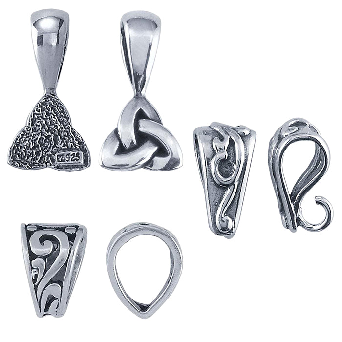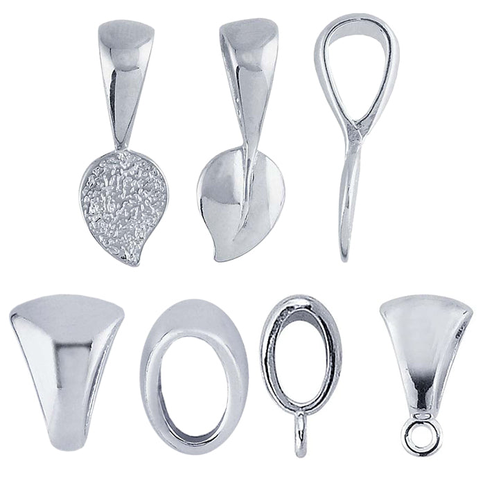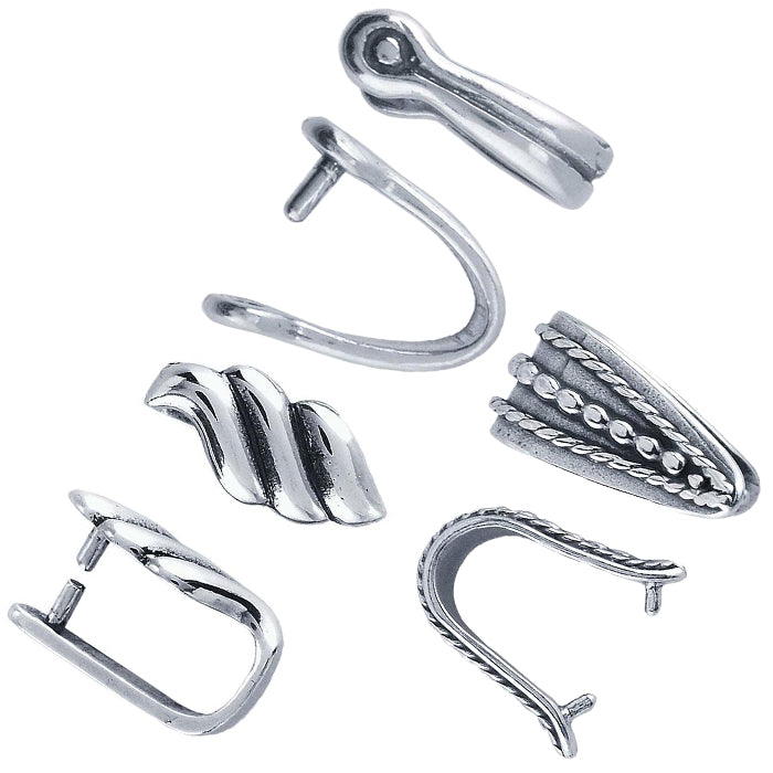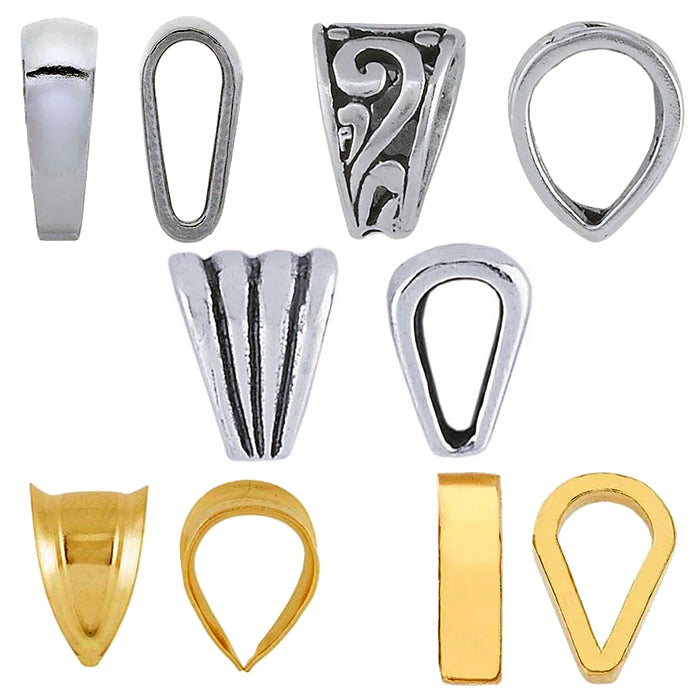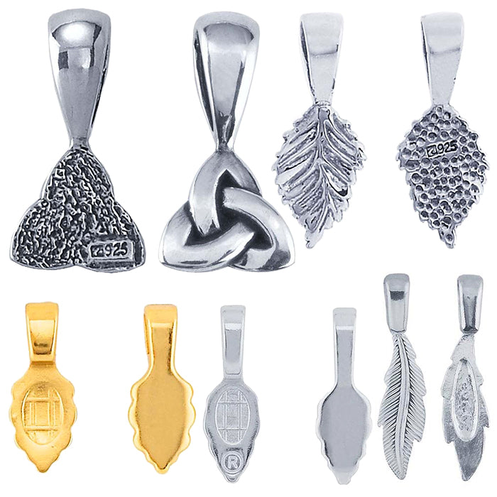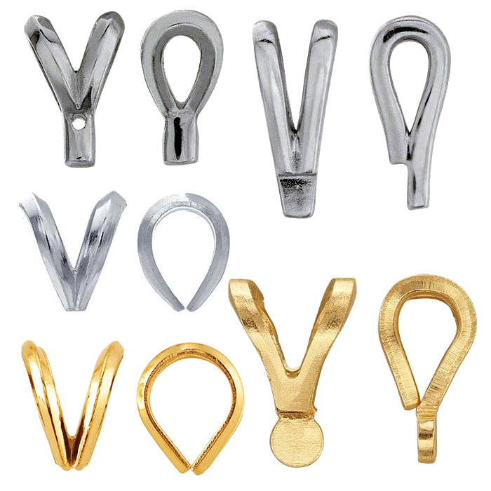 Explore an extensive selection of bails in solder-on, pinch, and glue-on styles to suit your specific pieces and production methods. For PMC® creations, we also offer Embeddables® pendant bails. Decorative glue-on bails provide a quick, simple way to transform custom glass pieces, cabochons, or other flat-backed designs into polished, ready-to-wear pendants.