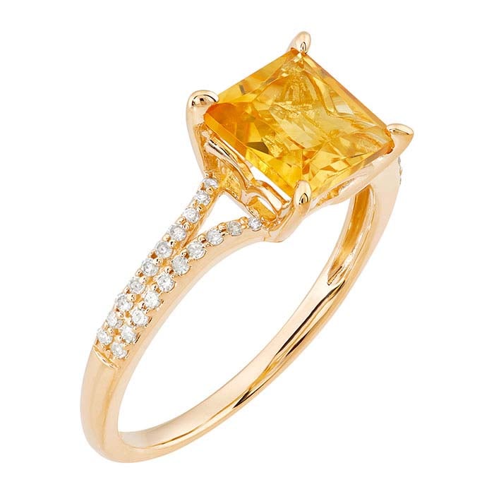 यह 10-कैरेट पीले सोने की अंगूठी केंद्र में 7mm वर्गाकार सिट्रीन फेसेटेड रत्न के साथ है। स्प्लिट बैंड में कई गोल सफेद हीरे सेट हैं (I3 स्पष्टता/G–I रंग; 1/8CTTW)।