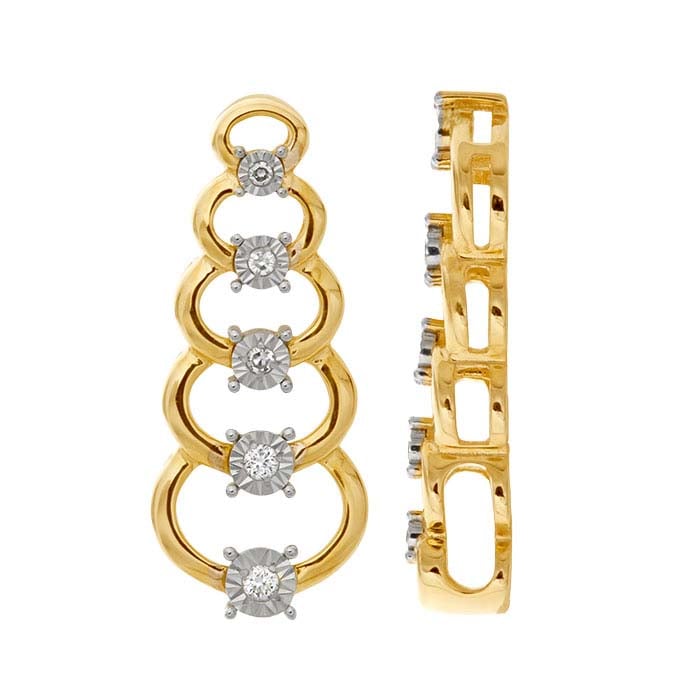 यह 10-कैरेट पीले सोने का पेंडेंट पांच क्रमिक खुले अंडाकारों से सजा है और इसमें 14-कैरेट सफेद सोने की इल्यूजन सेटिंग्स में पांच गोल सफेद हीरे जड़े हैं: एक 0.012-ct., एक 0.01-ct, दो 0.005-ct. और एक 0.0035-ct. (I1–I2 स्पष्टता/H–J रंग; 0.2CTTW)। इसके पीछे एक छिपा हुआ बेल है जो पेंडेंट को बिना किसी दिखाई देने वाले कनेक्शन के कॉर्ड या चेन पर आसानी से स्लिप करने देता है, जिससे देखने वाले की नजर भटकती नहीं है।