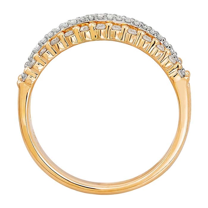 यह 10-कैरेट पीले सोने की वेडिंग बैंड स्टाइल अंगूठी कई गोल सफेद हीरों (I3 स्पष्टता/G–I रंग; 1/3CTTW) के साथ तीन पंक्तियों में सेट की गई है। यह लगभग किसी भी सगाई की अंगूठी की शैली में एक शानदार जोड़ है और वर्षगांठ की अंगूठी के लिए एक आदर्श विकल्प बनाती है।