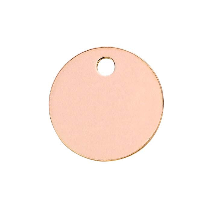 Attach this 14/20 rose gold-filled double-clad round quality tag (sometimes called a design or jewelry tag) to let your customers know what is special about your design; stamp or lightly engrave information such as the purity of the metal, country of origin ("Made in the USA"), or your logo or signature design. For a different look, engrave this tag deeply to create a two-tone look once you form the stamping as desired. The tag is die struck with clean, crisp edges and will require some finishing to smooth its edges and polish its surface.This tag is soft; it may arrive slightly domed and will be easy to shape as desired.