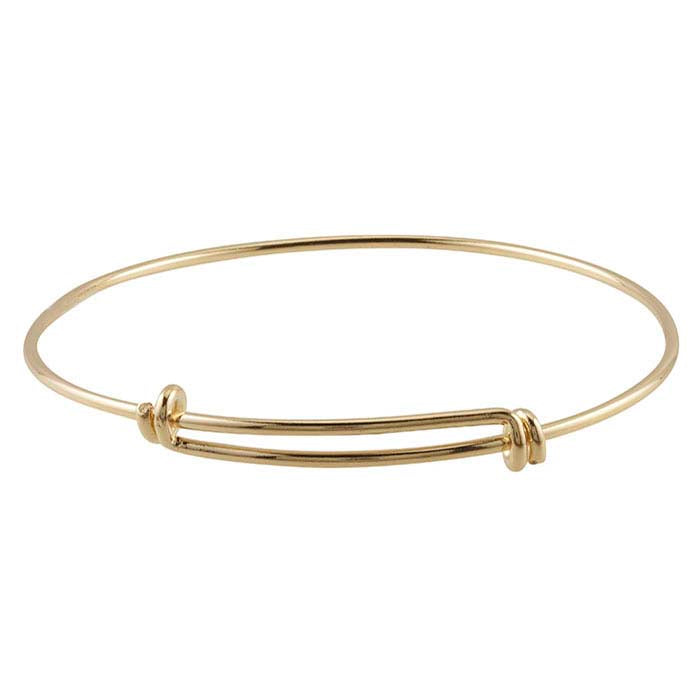 The design of this bright yellow gold-plated brass bangle bracelet allows the wrapped ends to slide freely along the wire, so that customers can expand the bracelet (up to approx. 2-1/2" ID) to ensure easy-on/easy-off wear. The simple design makes it a terrific foundation for adding charms or other design elements. This bracelet is plated with yellow gold to help you offer customers precious metal with the color of gold at a more attractive price.