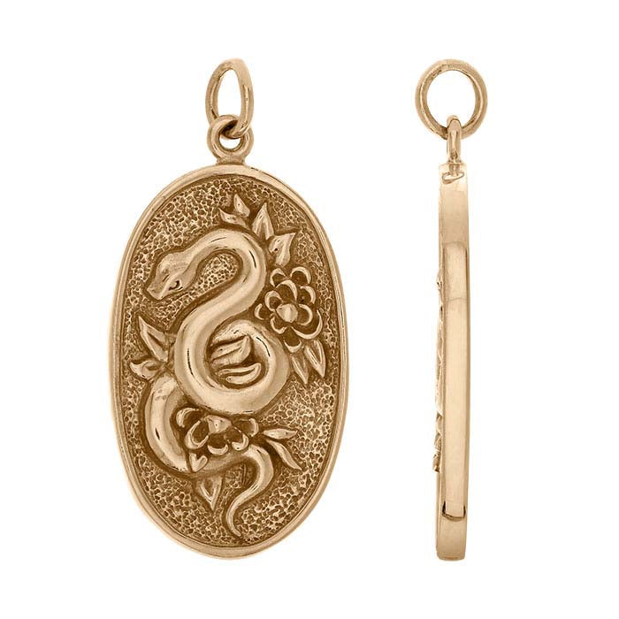 यह कांस्य लटकन एक अंडाकार आकार में है जिसमें एक सांप और फूल का डिज़ाइन एक बनावट वाले पृष्ठभूमि पर है। इसे एक कॉर्ड या चेन हार के केंद्र बिंदु के रूप में उपयोग करें या इसे विभिन्न चार्म, घटकों या मोतियों के साथ मिलाकर अधिक जटिल डिज़ाइनों में संयोजित करें। लटकन में एक बंद अंगूठी शामिल है।