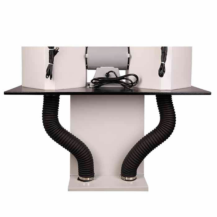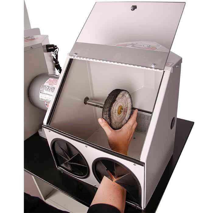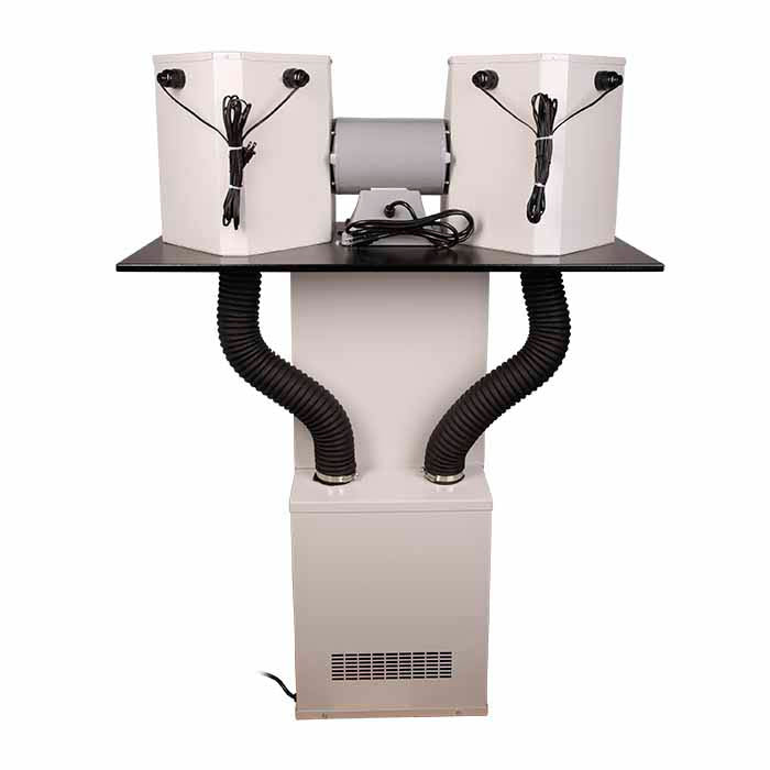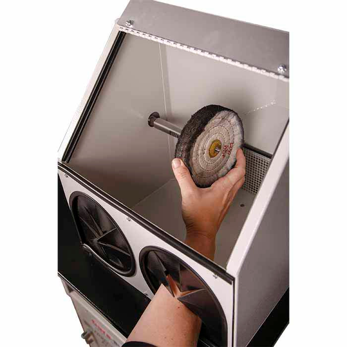 • दो "सुपर फ्लो" एनक्लोज्ड पॉलिशिंग हूड्स इंटीरियर लाइट के साथ, 14"चौड़ाई x 15"गहराई x 15-1/4"ऊंचाई (336008)।