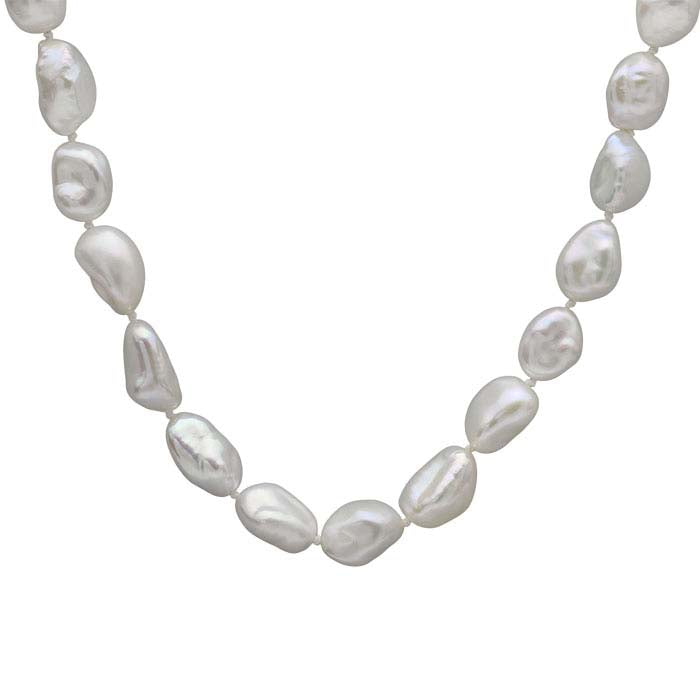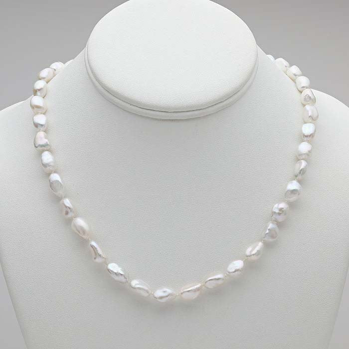 यह तैयार मोती की माला प्राकृतिक 8–9 मिमी सफेद केशी मोतियों से बनी है। इसे 14-कैरट पीले सोने से प्लेटेड स्टर्लिंग सिल्वर पुश रिलीज क्लास्प के साथ समाप्त किया गया है।