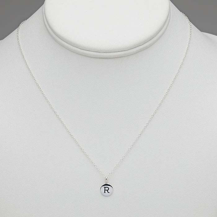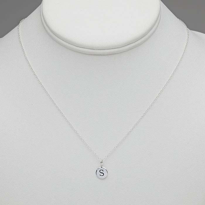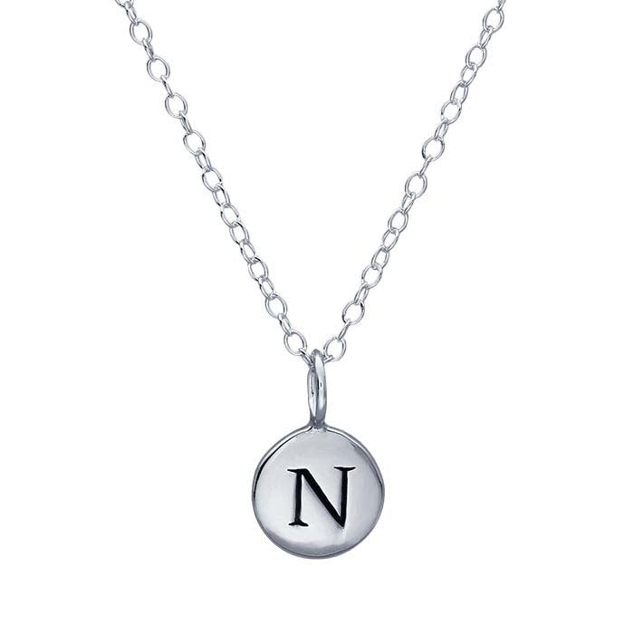 This finished sterling silver necklace is made with a 0.86mm cable chain and features a 9mm round disc charm with an oxidized uppercase block letter. A spring ring and a 2" chain extender complete the design.