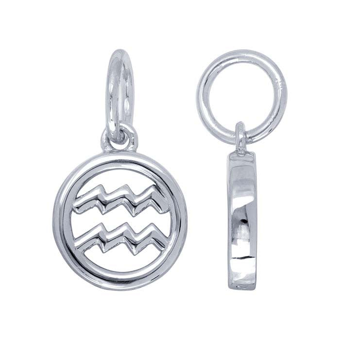 This sterling silver zodiac charm features a round shape with an Aquarius symbol in the center. Create an earring drop or combine it with other charms and components in more complex necklace, bracelet and anklet designs. This charm includes a jump ring.