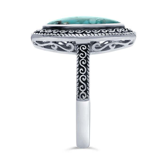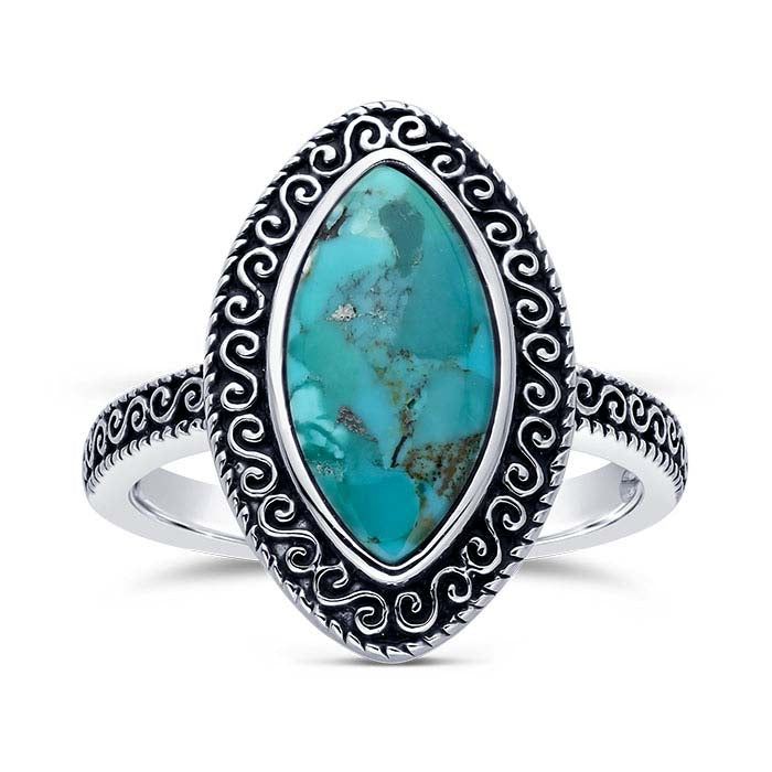 This sterling silver ring is set with one marquize-shaped Chinese turquoise cabochon. It features a filigree design around the stone and shank and is oxidized to accentuate the details. It’s attractive as a stand-alone accessory or stacked in combination with other rings. Offer customers a variety of stackable ring styles to mix and match, and encourage them to create their own changeable designs.