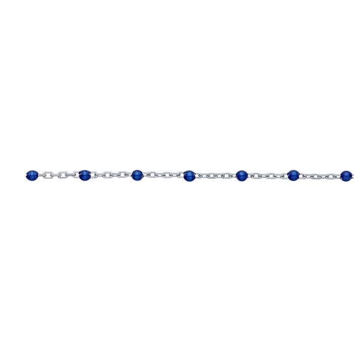This sterling silver cable chain has an added visual twist with 2mm blue enameled beads evenly spaced along its length. The result is a chain that is pretty enough to stand alone, but also makes a nice complement to delicate drops and pendants. Rhodium plating provides a durable, tarnish-resistant finish.The most common chain style, cable chains are formed by simply connecting single links perpendicularly end to end. Links may be round, oval or other shapes.