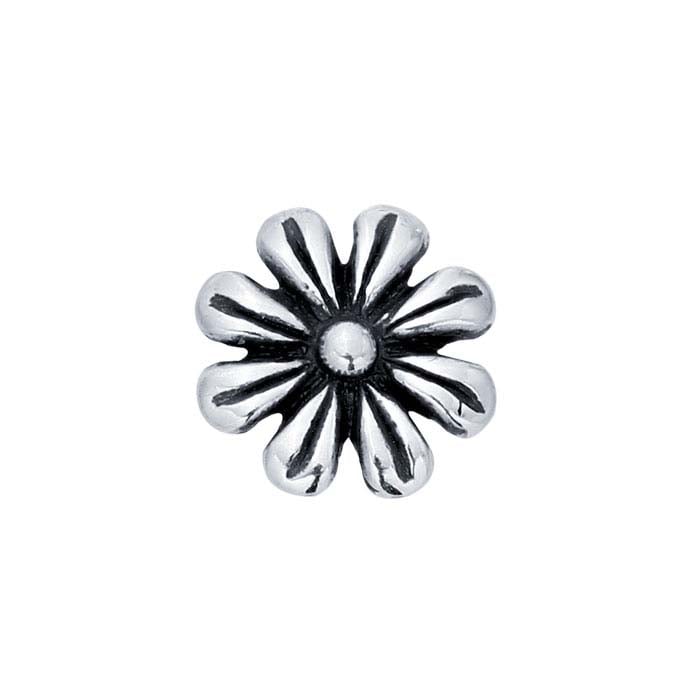 This sterling silver component features a detailed flower with eight petals and has a flat back. Without a ring, the component is ideal for use as a ringless charm that can be used with any of our floating glass lockets. Alternatively create a design in deep bezel components or findings that are intended for use with clear resin, or solder a bail or ring onto the component to create a charm or drop. This component is oxidized to highlight the detail.