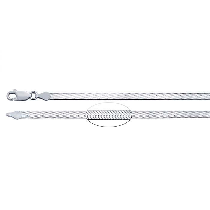 यह स्टर्लिंग सिल्वर हेरिंगबोन चेन एक क्लासिक लुक प्रदान करती है; चेन की चौड़ी, सपाट प्रोफ़ाइल नेकलाइन के ऊपर सपाट रहती है। यह लचीली चेन टिकाऊ, जंग-प्रतिरोधी फिनिश के लिए रोडियम से प्लेटेड है। हेरिंगबोन चेन कई पंक्तियों में V-आकार के लिंक से बनी होती है, जिन्हें इस तरह व्यवस्थित किया जाता है कि प्रत्येक पंक्ति की दिशा उसके बगल की पंक्ति के विपरीत होती है। लिंक सपाट रहते हैं जिससे चेन का प्रोफ़ाइल कम और लचीला दिखता है। इस चेन को मोड़ने से बचाने के लिए सपाट रखें। इस प्रकार की चेन अकेले स्टेटमेंट पीस के रूप में आदर्श है; इसे पेंडेंट के लिए अनुशंसित नहीं किया जाता।