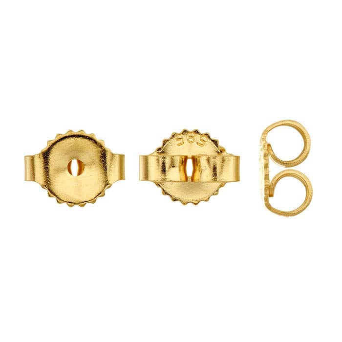 Questo dado per orecchini a frizione in oro giallo 14 carati è pesante, ideale per design di orecchini pendenti e a goccia. Presenta una superficie liscia con bordi decorativi smerlati. L'attrito tra le ali mantiene l'orecchino saldamente in posizione.