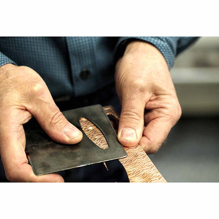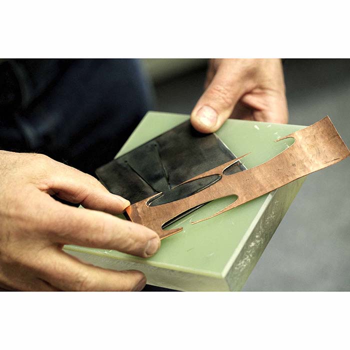 Questa matrice di sbavatura in acciaio per utensili produce un piccolo blank per anello (52,4 mm di lunghezza x 14,3 mm di larghezza) da lamiera metallica fino a 18 gauge di spessore. Il blank, una volta tagliato, è pronto per essere piegato, formato e levigato nel design dell'anello desiderato. Le matrici di sbavatura permettono ai gioiellieri di tagliare rapidamente e ripetutamente più blank metallici della stessa forma e dimensione esatta. Queste matrici sono realizzate da un singolo foglio di acciaio per utensili (circa 2,4 mm di spessore) e presentano una forma creata da un taglio continuo attraverso il metallo. Il taglio forma una "linguetta" di metallo nel foglio con la forma del blank desiderato all'estremità libera.
