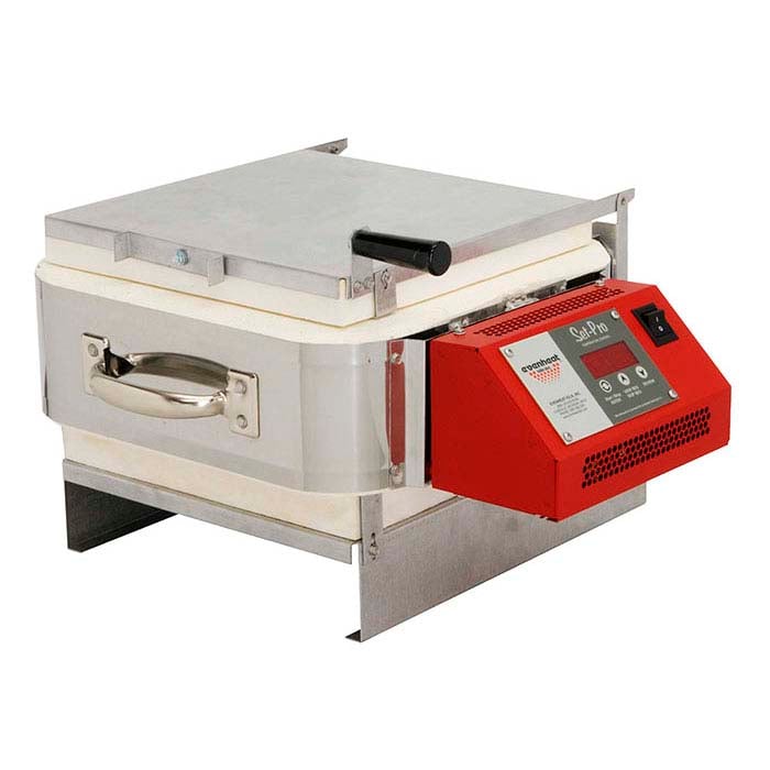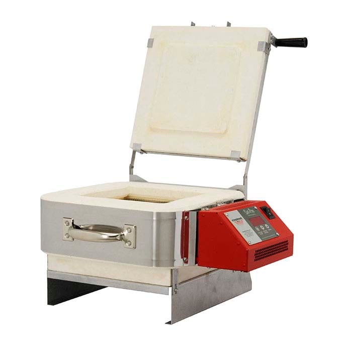The dual-access options offered by this kiln and its ten pre-set firing programs make this kiln ideal for firing metal clay. Access the interior of the kiln from the front or from the top. Top-access, by lifting the stay-cool handle at the side of the lid, provides a traditional loading of workpieces into the firing chamber, using forming tools that require a vertical approach. It also offers easy placement of larger items such as slumping molds and forms. The hinged lid, with its built-in venting, allows for excellent ventilation opportunities.
