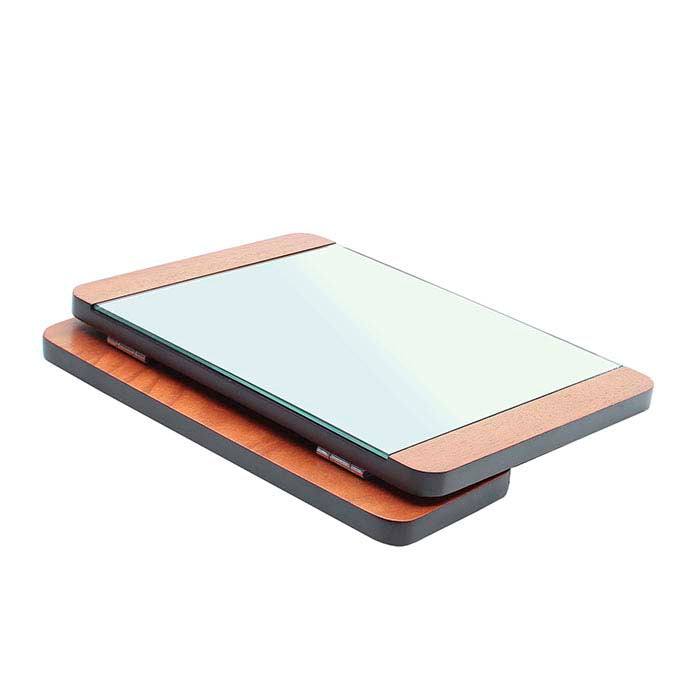 Lo specchio con cornice robusta e regolabile (10-1/4"L x 3-1/4"P x 7-1/2"A) presenta uno specchio in vetro monofacciale senza distorsioni e consente ai clienti di vedere i gioielli indossati. Una base con cerniera permette di posizionare lo specchio in orizzontale o verticale, e si ripiega completamente sul retro per una facile conservazione o trasporto. La cornice è in legno con finitura scura.
