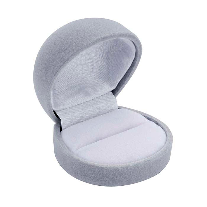 Rivestita in velluto grigio, questa scatola per anelli con cerniera presenta un design rotondo unico ed è ideale per confezionare o esporre un anello. Aggiungi un nastro decorativo, una confezione regalo o un fiocco (disponibili separatamente) per personalizzare la scatola. Il velluto grigio riveste la scatola di plastica con una fodera in raso bianco che copre la cerniera; il velluto dello stesso colore riveste l'inserto in cartone. Confezionata in un imballo monopezzo.