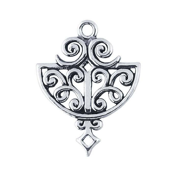 This sterling silver filigree link component features an open Art Deco-style fan and makes a versatile addition to your designs. A combination of curved, swirling lines and geometric forms make the component an ideal choice for earrings or a pendant. Attach a gemstone dangle to the square ring at the bottom of the component for an eye-catching earring drop, or use jump rings to connect multiple components in necklace and bracelet designs. The component is oxidized to highlight the details.
