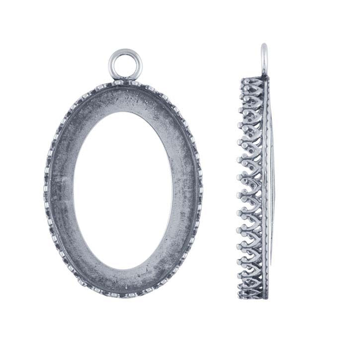 This sterling silver bezel component mounting features walls modeled from gallery wire and holds one 25 x 18mm oval cabochon or other flat-back stone. A wide rim inside the walls supports the stone and reduces metal weight, making the mounting more affordable. Use the component as an earring drop, a delicate pendant, or as one element in more complex necklace and bracelet designs. Bezel cups provide an easy way to set your stones and finish with clean lines and professional-looking results. Place your stone in the bezel and push the walls inward over the stone, holding it in place. For added security, if desired, place a drop or two of jeweler's epoxy in the cup before placing the stone. The component is oxidized to highlight the details.