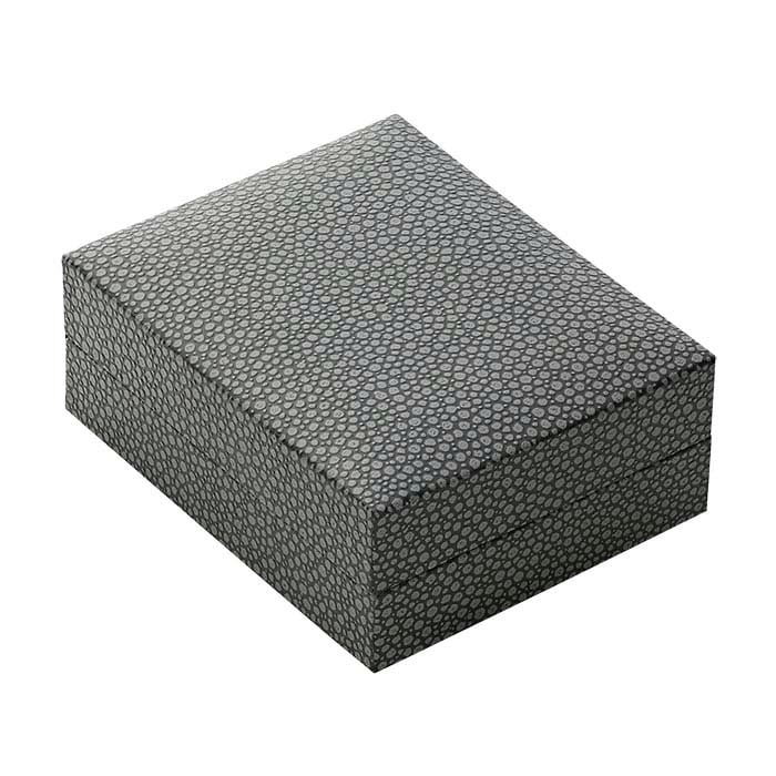 This elegant and highly-textured leatherette-covered gift box accommodates one pendant or one pair of earrings. The leatherette is a durable man-made material that imitates the pebbled surface typical of stingray leather; the characteristic granular pattern of the stingray, ground flat to reveal the lighter, inner color of the granules, presents an attractive, luxury look and feel that is ideal for presenting any jewelry item. Dyed gray, the substantial textured material covers a hinged wood box; the interior of the box offers a dark slate-gray soft suede material that covers the hinge and lines the interior of the box. The insert includes a satin pull-tab that makes it easy to lift the jewelry out of the box without distorting or damaging it. Known for centuries as "shagreen," the texture of these exotic leathers have been popular and in high demand for high-end luxury accent and accessory items. True shagreen, made from untanned stingray, shark or other cartilaginous hides that are covered with numerous bony denticles, presents the beautiful, pebbled textures that has been re-created in the proprietary environmentally friendly leatherette material covering this box. This box is delivered in a two-piece cardboard packer. Hot stamp the cardboard packer with your company name or logo, keeping you top-of-mind long after the jewelry sale. Add a decorative ribbon, gift wrapping or bow (available separately) to customize the box.