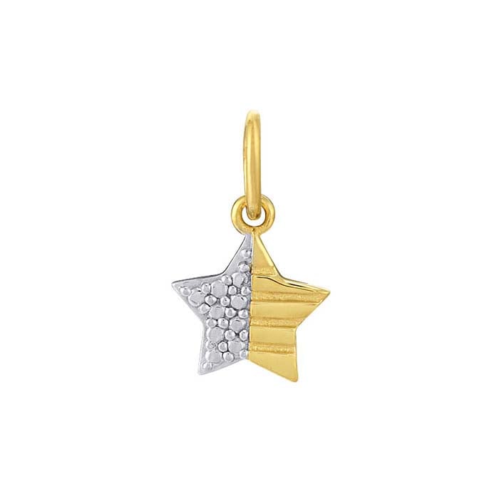 この14カラットイエローゴールドのチャームは、五芒星を特徴としています。星の半分はビーズ状のテクスチャーが施され、ロジウムメッキが施されています。イヤリングのドロップとして使用するか、他のチャームやコンポーネントと組み合わせて、より複雑なネックレス、ブレスレット、アンクレットのデザインに活用できます。このチャームにはジャンプリングが付属しています。