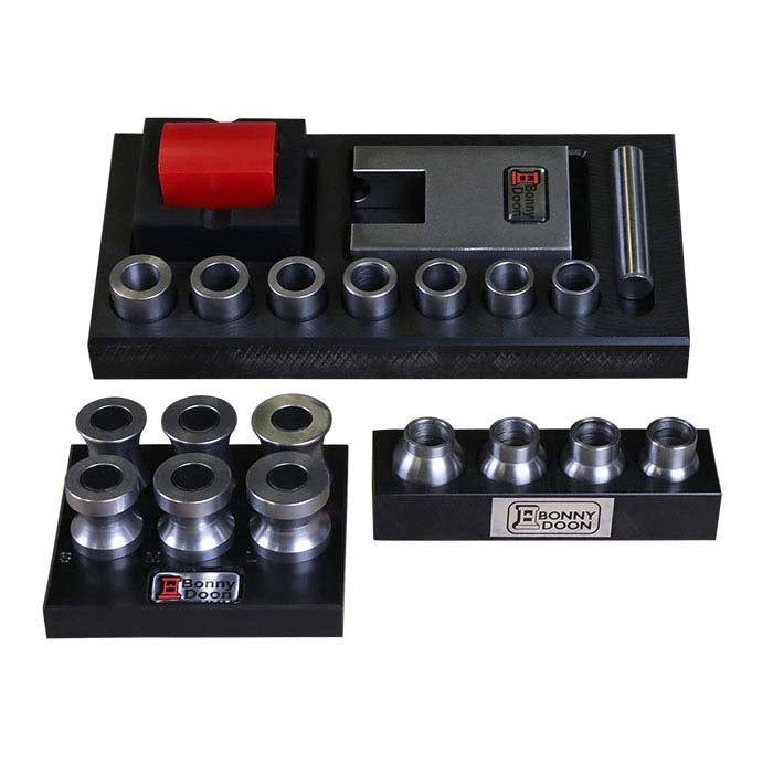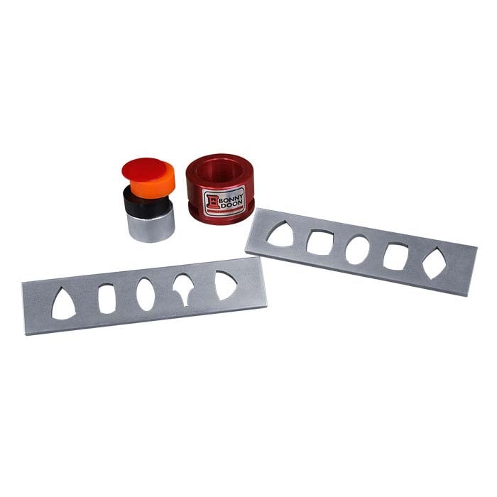- A five-year warranty for manufacturing defects on the press and cylinder. A one-year warranty for manufacturing defects on the electric pump. Deluxe Starter KitThis kit allows you to accomplish virtually any metal forming task with your hydraulic press. It includes a wide array of Bonny Doon tooling and accessories such as mushroom formers, forming dies and sets, top spacers, face plates, urethane pads and more. The master tool holder bolts to the upper platen of your press and has a 1"-diameter hole that accepts tooling.