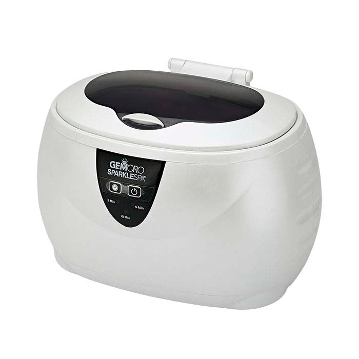 この魅力的で省スペースなGemOro® SparkleSpa® 超音波洗浄機は、家庭、工房、販売環境に最適なアクセサリーです。超音波洗浄は、宝飾品から汚れ、油脂、化粧品、その他の日常的な汚染物質を除去し、美しさを保ちます。カウンタートップに展示して販売することで、SparkleSpaは追加販売商品や、大きな宝飾品購入時の顧客へのギフトとして最適です。ステンレス製タンクはプラスチック製の筐体に収められ、蒸発防止のヒンジ付きカバーが付いています。本体には3分、5分、10分のサイクルを選べるデジタルタイマーが内蔵され、自動停止機能があります。この洗浄機には取り外し可能なパーツバスケットと、時計本体を外さずにバンドを洗浄できる時計スタンドが付属します。明るい青色LEDライトがステンレスタンクを照らし、作業中のワークピースを確認できます。普通の水道水または蒸留水で動作し、最良の結果を得るにはGemOro® SparklePak Plus洗浄液(別売)を加えてください。本機器にはメーカーの1年間限定交換保証が付いています。