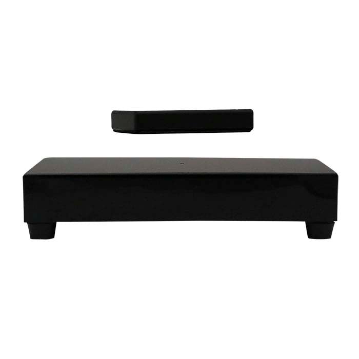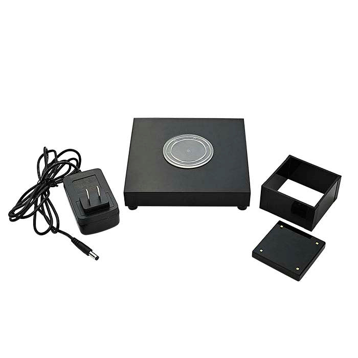 この光沢のある黒い正方形のアクリルディスプレイは、対応する磁気の四角い浮遊プラットフォームと連動する革新的な誘導電力充電ベースを使用しています。プラットフォーム自体は四隅に4つの明るいLEDライトが点灯します。充電ベースの電源が入っていて磁気の四角いプラットフォームが正しく中央に配置されていると、プラットフォームはベースの上12~15mmに浮かび、ゆっくりと連続的に回転します。