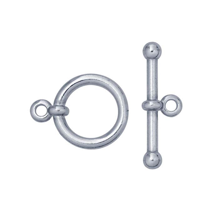 This sterling silver toggle clasp features ball ends and a smooth, bright finish. It is an ideal choice for light- to medium-weight necklaces and bracelets made with silver chain and beads. A toggle clasp is a two-part clasp consisting of a ring and a bar. The bar end requires a short length of chain to allow it to slide lengthwise through the ring, then turn sideways so that it cannot fit back through the ring, effectively closing the jewelry piece. To open, the bar is simply pulled further through the ring just far enough to allow it to turn lengthwise again and slide back through the ring.