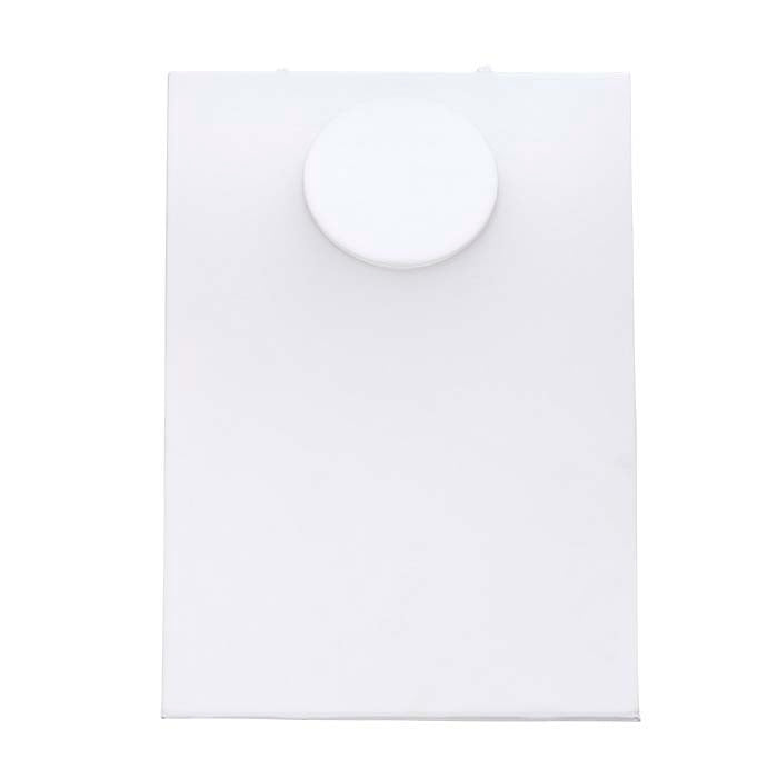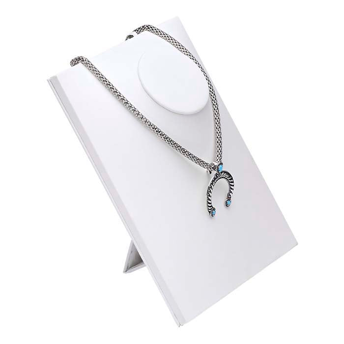 このネックレスバストディスプレイは、使いやすい二段階折りたたみイーゼルを備えており、フック&ループの取り付けポイントにより、ジュエリーアイテムに最適なディスプレイのプロファイルを変更できます。高さわずか4-1/2インチの低角度プロファイルに調整するか、高さ8-1/2インチのほぼ垂直なプロファイルを選択できます。このバストの輪郭は、どちらのプロファイルでもネックレスやペンダントに自然なドレープを与え、着用時のジュエリーの見え方を顧客に示します。ネックレスを完璧な長さに調整してエレガントに演出できます。最も高い位置では、余分なチェーンをディスプレイ背面のイーゼルの穴に通すことが可能です。イーゼルは平らに折りたたんで収納や持ち運びに便利です。白のフェイクレザーがパッド入りの段ボールフォームを覆っています。