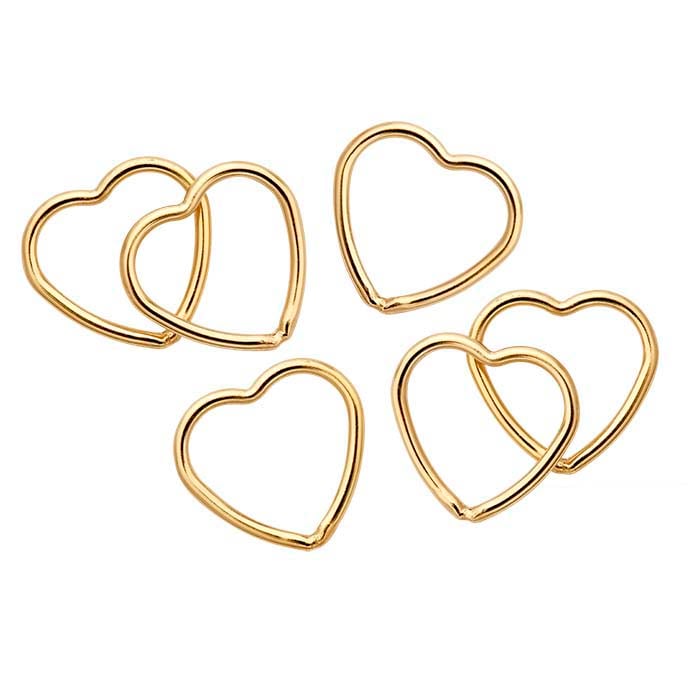 この14/20イエローゴールドフィルドコンポーネントは、チャームとして、またはより複雑なデザインの装飾部品として理想的なクラシックなオープンハート形状を特徴としています。ジャンプリングを使用してこれらのコンポーネントを複数連結し、ネックレスやブレスレットを作成するか、シンプルなペンダント用にベイルを追加してください。ゴールドフィルドコンポーネントは、ソリッドゴールドよりも手頃な価格でカラットゴールドを提供し、貴金属の質感を求めるお客様のニーズに応えつつ、お客様に喜ばれる価格でデザインを提供できます。"}