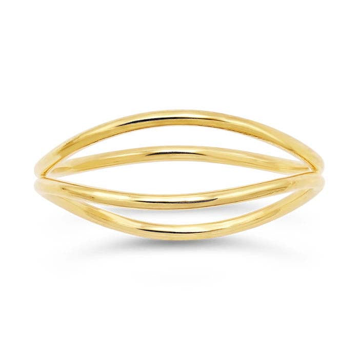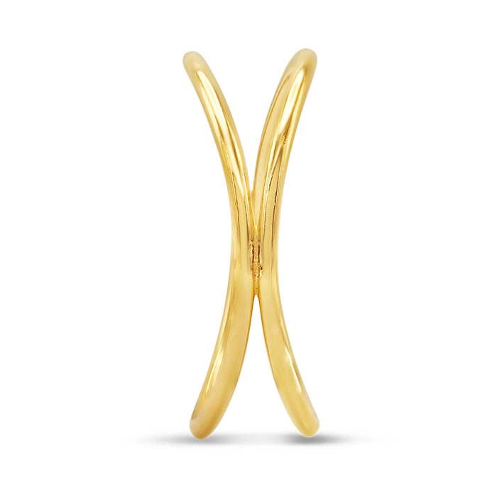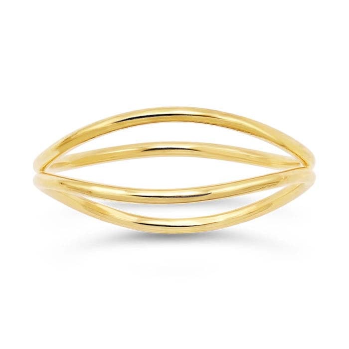 この14/20イエローゴールドフィルドリングは、両側で合わさる2本のバンドが波のようなデザインを作り出しています。単独で着用しても素敵ですし、重ね付けスタイルに個性を加えるのにも最適です。このリングは均一な色合いを保つために14金イエローゴールドでメッキされています。