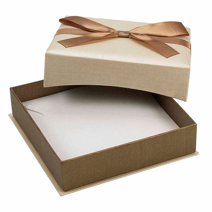 この目を引く二部構成のギフトボックスはネックレスを収納でき、蓋にはリボンとボウのアクセントが固定されており、追加の装飾が不要で、簡単かつ時間を節約できる包装オプションです。蓋の下部の2辺にはスカラップ状の切り抜きがあり、箱を開けやすくしています。箱の底はゴールドカラーのリネン調紙で覆われ、箱の上部はクリームカラーのリネン調紙で覆われています。インサートは白のフロック加工フォームのダイカットで、アクセントリボンは箱の底の色に合わせています。