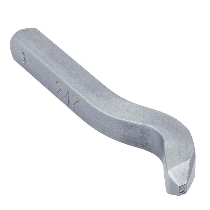 This bent marking stamp reads "24K"; ideal for quality-marking your designs. The stamp is precision-engraved from 5/16" tool steel oil-hardened to 58/62 HRC, delivering crisp, detailed surfaces and a long service life. Stamps with a bent shank have a notch near the tip that makes them ideal for stamping curved surfaces such as the inside of a ring or bangle; the slightly domed striking surface ensure a crisp, clean mark. For best results—and because any stamped mark is not easy to remove once it's made—it's important to practice before attempting to mark your jewelry designs. Scrap pieces of sheet or base metal ring blanks are ideal for helping you get the feel of both the stamp and the power needed for an effective hammer strike. Use a brass mallet to strike the stamp to help prevent damage to your stamp, and support your workpiece on a bench block or an anvil. Finally, do your stamping before setting stones so that there is no risk of damaging settings or loosening set stones.