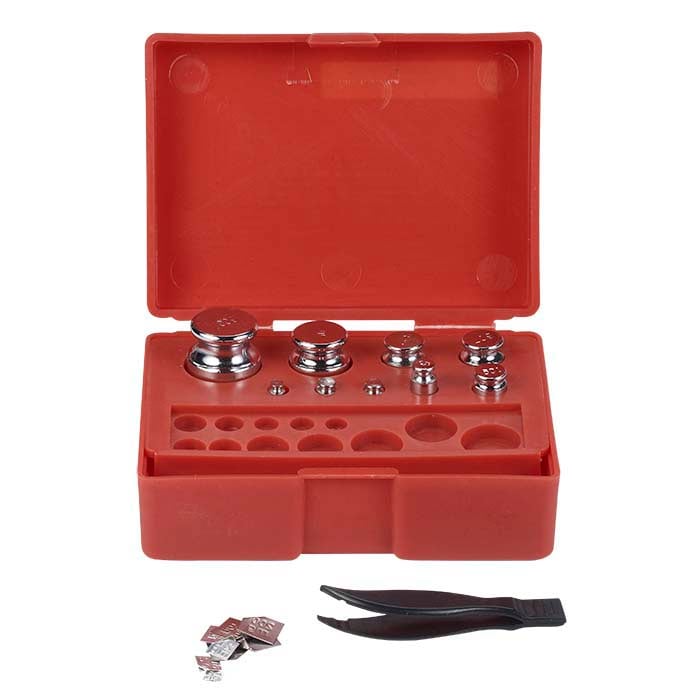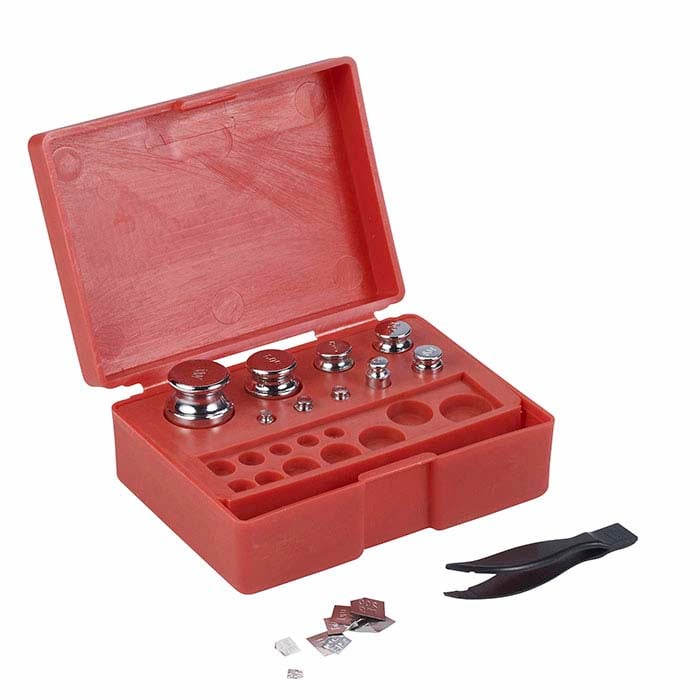 • 17개의 추: 100g (1), 50g (1), 20g (2), 10g (1), 5g (1), 2g (2), 1g (1), 500mg (1), 200mg (1), 100mg (2), 50mg (1), 20mg (2) 및 10mg (1)