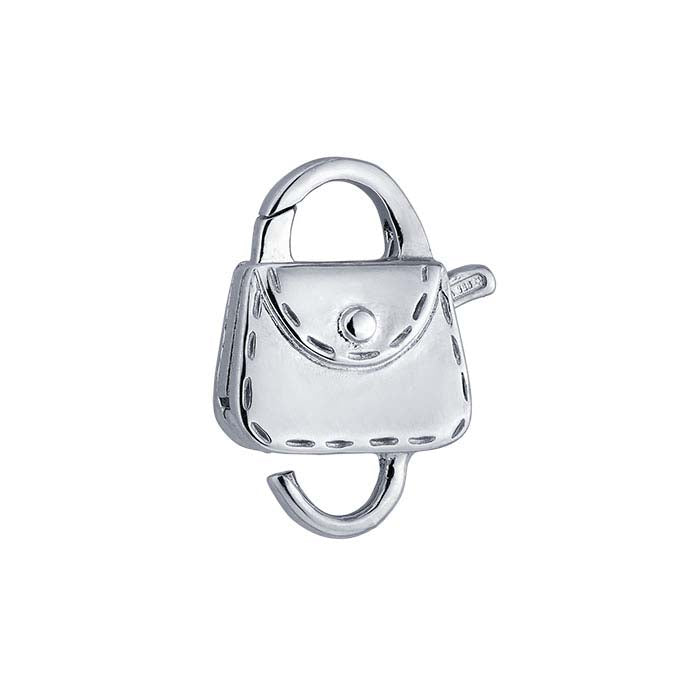 This sterling silver clasp features a life-like purse shape with a smooth, bright finish perfect for personalized or themed necklace and bracelet designs. An open attach ring is included at the bottom of the clasp. One of the most common clasp styles, the lobster clasp offers a streamlined look and good security for all types of strands. Named for its resemblance to the action of a lobster claw, this clasp features a hook shape with a spring-operated closure. Simply press the ring at the opposite end of the strand against the closure, pushing it open enough to let the ring pass onto the hook (or press the release lever to open the closure). The spring holds the clasp closed until the lever pulls it open to release the ring.
