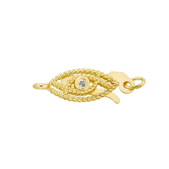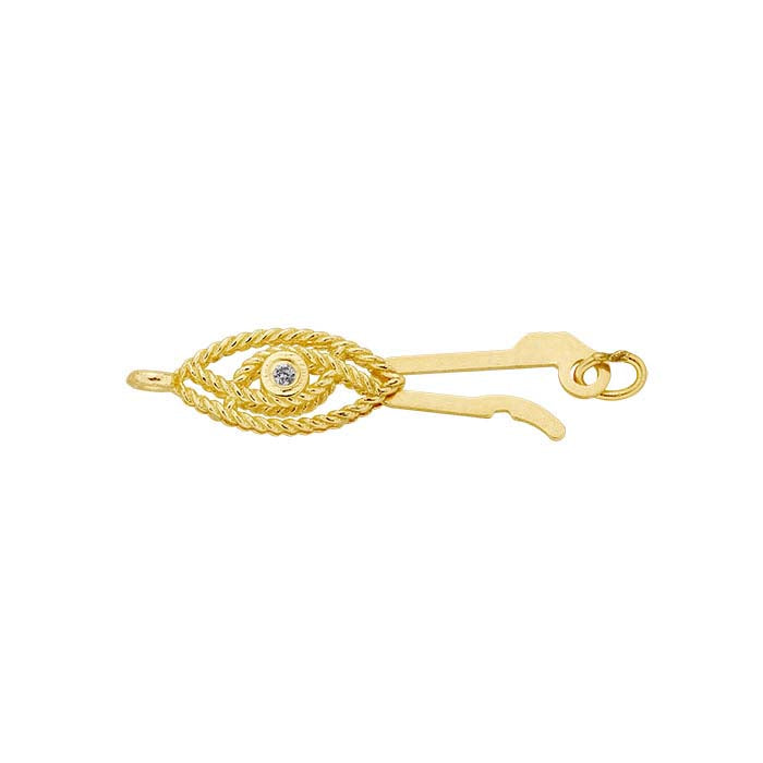 이 14캐럿 옐로우 골드 안전 잠금장치는 로프 디자인과 중앙에 하나의 화이트 다이아몬드(I1 투명도/G-H 색상; 0.001CTTW)를 갖춘 마퀴즈 형태입니다. 길쭉한 형태와 섬세한 패턴은 진주 목걸이나 기타 비즈 목걸이와 잘 어울립니다. 안전 잠금장치(진주 잠금장치라고도 함)는 두 부분으로 구성되어 두 가지 방식으로 연결되어 고가의 목걸이나 스트랜드 분실을 방지하는 이중 안전장치를 제공하며, 진주 및 보석 스트랜드에 이상적입니다. 잠금장치 내부 부분은 외부 가장자리에 톱니가 있는 가느다란 후크이며, 외부 부분은 잠금 바를 제외하고는 비어 있습니다. 내부 부분이 잠금 바 위에 걸린 후 외부 부분 안으로 미끄러져 들어가며, 톱니가 내부 측면에 걸려 잠금장치를 단단히 닫아줍니다. 톱니가 어떤 이유로 실패하더라도 후크가 스트랜드를 제자리에 고정합니다.