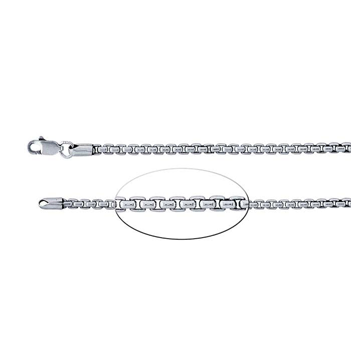 Box chain has squared-off links that resemble cubes; they are sturdy chains, ideal for pendants. In rounded box chain, the links are created from half-round wire, giving the finished chain a rounder profile.