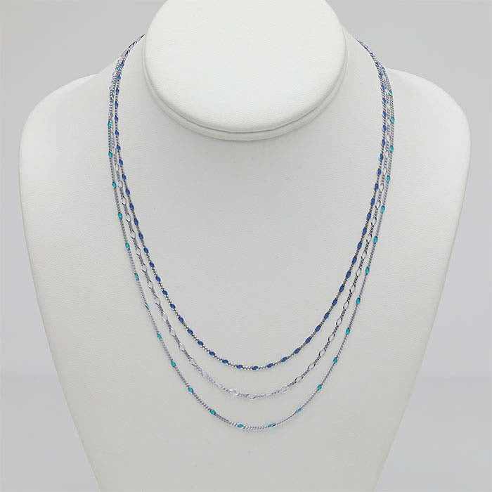 This sterling silver necklaces features three graduated strands of chain. The shortest and longest strands have blue enameled links while the middle strand is figaro chain. Rhodium plating provides a durable, tarnish-resistant finish.