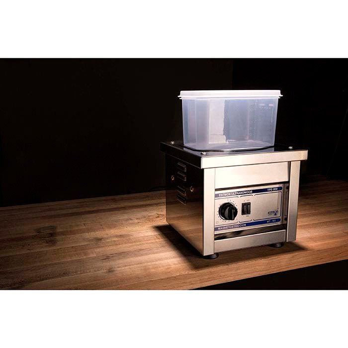 Even if you have been using pin finishers for years, you have never seen the incredible action this super-agitating magnetic finisher delivers to your work! The first feature you may notice is the rectangular bowl that sits atop the finisher. This is part of the equation but the real magic happens inside the stainless steel housing. There, a powerful, 1/3hp motor and a proprietary system of magnets—that takes advantage of both negative and positive poles—creates a unique magnetic field within the tank. Not only the pin media but your workpieces as well are irresistibly drawn laterally around the tank and vertically up and down through the solution. The clear plastic bowl (10-3/8"W x 6-1/2"D x 6-1/16"H), with its short and long sides and rounded corners, also helps keep the media and solution continually churning. Keep extra bowls (available separately) on hand to increase your production; have one bowl running while you load and unload workpieces into a second. In addition, the pin media have smooth, rounded ends and are made of a special stainless steel alloy that supports the superior finishing of this machine. Your workpieces are finished faster and more effectively than is possible with any other pin finisher. Ideal for small to medium finishing and tumbling runs, the 4.3-liter bowl holds 200 grams of stainless steel pin media (0.5mm x 5mm; included) and accommodates up to 500 grams of workpieces (with 200g media, that's a 700-gram load of product that you can finish per batch). A built-in 30-minute timer allows you to set the finisher for automatic operation; alternatively, use the manual setting to turn the finisher on and off as needed. Bowl includes a snap-on, water-tight lid.