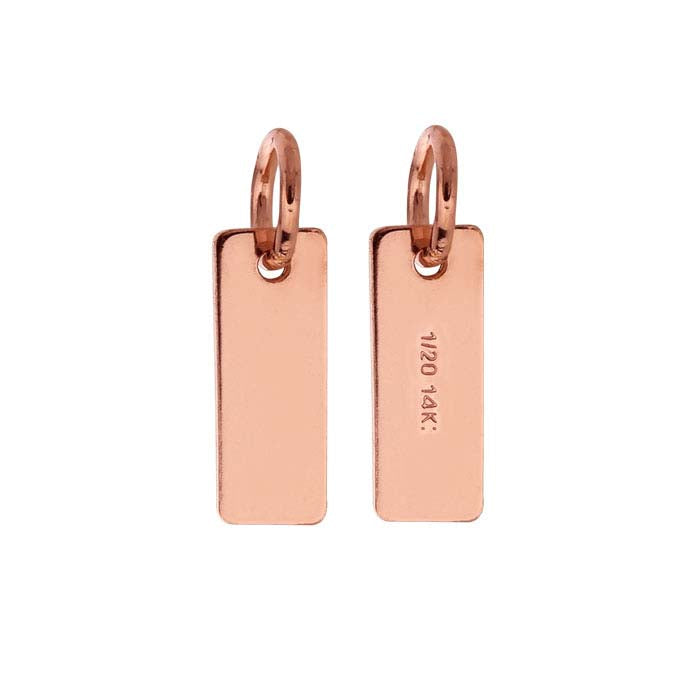 Šis 14/20 rožinio aukso užpildytas dvigubai dengtas stačiakampio formos kokybės žymeklis (kartais vadinamas dizaino arba papuošalų žyme) turi „1/20 14K“ kokybės ženklą vienoje pusėje; ant kitos pusės galima įspausti arba lengvai išgraviruoti kilmės šalies pavadinimą („Pagaminta JAV“) arba jūsų logotipą ar unikalų dizainą. Norint kitokio vaizdo, šį žymeklį galima giliau išgraviruoti, kad susidarytų dviejų tonų efektas, kai formuosite spaudą pagal pageidavimą. Žymeklis yra štampuotas su švariais, ryškiais kraštais ir reikalauja šiek tiek apdirbimo, kad būtų sušvelninti kraštai ir nupoliruota paviršius. Komplekte yra žiedelis. Šis žymeklis padengtas 14 karatų rožiniu auksu, kad būtų užtikrintas vienodas atspalvis.