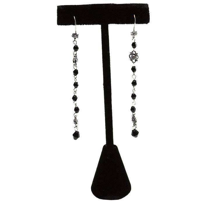 Šis T formos auskarų stovas, juodo aksomo, suteikia paprastą ir elegantišką vienos auskarų poros bet kokio stiliaus, įskaitant žiedinius iki 6" ilgio, pateikimą. T formos stovai puikiai tinka auskarų poroms eksponuoti, kad jos laisvai ir natūraliai kabėtų bet kokioje ekspozicijoje, stende ar vitrinoje. Plonos stovo linijos yra puikus pasirinkimas, kai ekspozicijos vietos yra ribotos arba jei norite santūraus, neužgriozdinto vaizdo; pagrindas yra sveriamas, kad stovą būtų sunku apversti. Linas turi subtilią tekstūrą, kuri dera praktiškai su bet kokio stiliaus papuošalais. Prabangus juodas aksominis linas dengia metalinę formą.