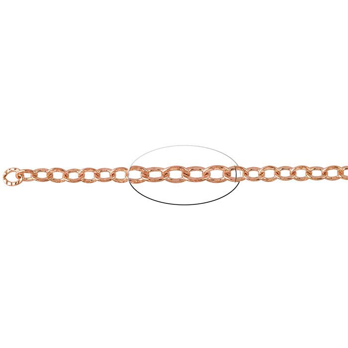 Šis kalto rašto piešinys ant plokščių varinės kabelinės grandinės grandelių suteikia gilumo ir įdomumo jūsų dizainams. Atviros grandelės gali talpinti pakabukus, kabliukus ar žavesius, o grandinė yra pakankamai tvirta, kad palaikytų didelius pakabukus. Dažniausiai pasitaikantis grandinės stilius – kabelinės grandinės, kurios susidaro paprastai sujungiant viengubas grandeles statmenai viena kitai. Grandelės gali būti apvalios, ovalios ar kitokios formos – šios grandinės grandelės yra ovalios.