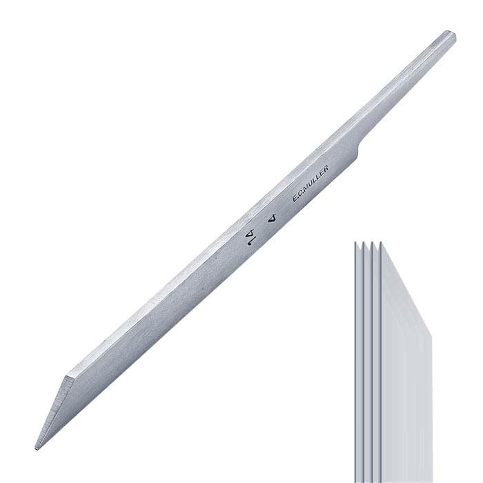 Šis E.C Muller #14 tiesios linijos graviruoklis siūlo keturias lygiagrečias linijas, tolygiai išdėstytas (0,177 mm atstumu) ant graviruoklio pjovimo paviršiaus (plotis apie 0,71 mm). Linijiniai graviruokliai yra prieinami su skirtingu linijų kiekiu pjovimo paviršiuje, o graviruoklio dydžio numeris apibrėžia atstumą tarp šių linijų. Naudokite linijinius graviruoklius blokiniam rašymui, Florencijos apdailai, foniniam šešėliavimui ir kryžminiams raštams ant plokščių arba išgaubtų metalinių paviršių; jie ypač tinkami vakarietiško stiliaus graviravimui. Daugumai darbų rinkitės tiesios linijos graviruoklius; trumpinkite, formuokite ir galandykite paviršių pagal atliekamą darbą. Šio graviruoklio aukštos anglies plieno sudėtis leidžia lengvai formuoti ir galąsti graviruoklį – tinkamas naudoti su visų rūšių metalais.