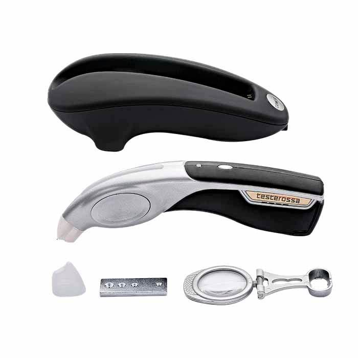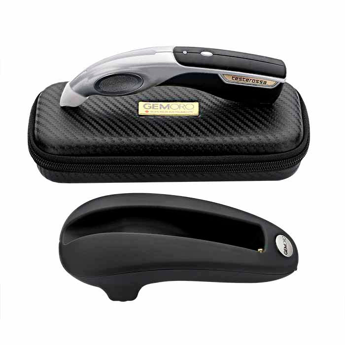 • Automatinio išsijungimo funkcija padeda taupyti baterijos energiją. Testarossa testeris apima: GemOro® UltraDock 3 įkrovimo stotį patogiam įkrovimui, saugiai laikant testerį paruoštą naudoti ir leidžiant bevielį darbą prie stalo ar prekystalio, kai reikia; reguliuojamą didinamąjį akmenų laikiklį; laisvų akmenų laikiklį; apsauginį anglies pluošto stiliaus užtrauktuku užsegamą dėklą su formuota įdėklo vieta testerio laikymui ir patogia tinkline kišene priedams laikyti.