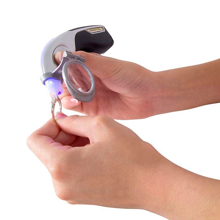 • Jame yra šviečianti šviesos juosta, kuri suteikia aiškius, spalvomis koduotus vizualinius rezultatus: ŽALIA – deimantas, MĖLYNA – moisanitas, ROŽINĖ – safyras ir RAUDONA – metalų signalas (įspėja, jei zondelis liečia metalą testuojant akmenis).
