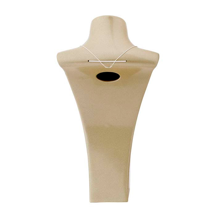 Šis plastikinis kaklo papuošalų stovas pasižymi plonu dizainu ir yra idealus vienam vėriniui ar pakabukui eksponuoti. Stovas turi lygią metalinę, blizgią auksinę apdailą, o kontūras atspindi papuošalus natūralioje padėtyje, kad klientai galėtų matyti, kaip jie atrodys dėvimi. Elastinga juosta stovėlio gale leidžia reguliuoti vėrinio ilgį iki idealaus eksponavimo, o ovalus išpjovimas slepia papildomą grandinėlę, užtikrinant tvarkingą ir profesionalų pristatymą.