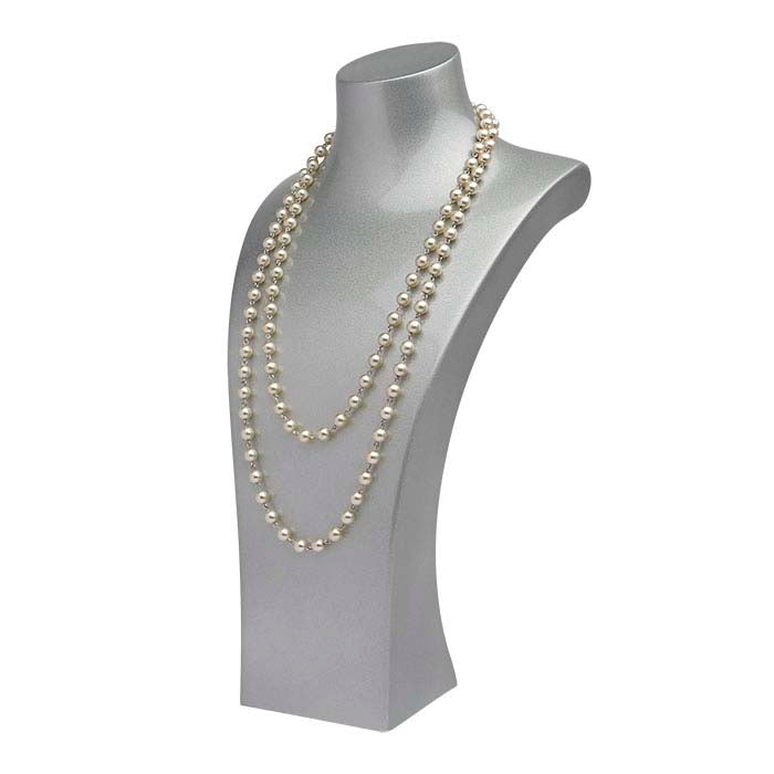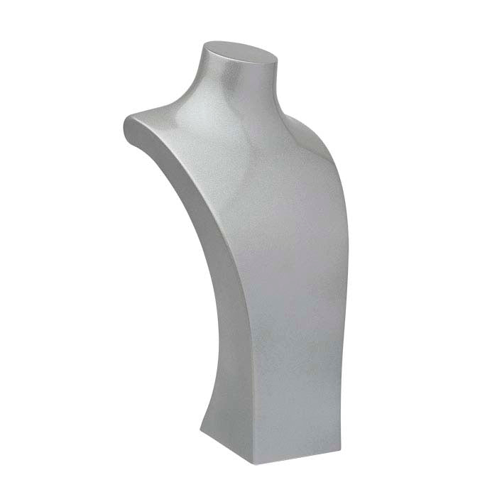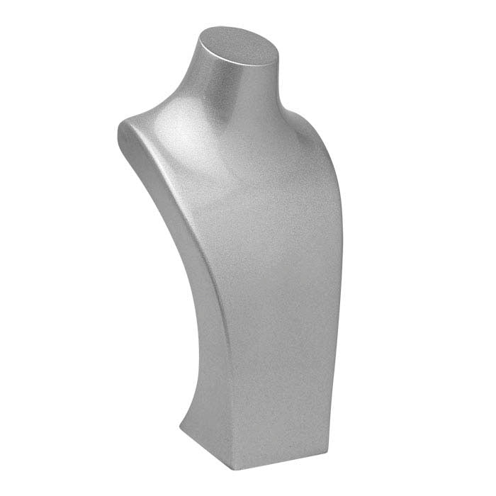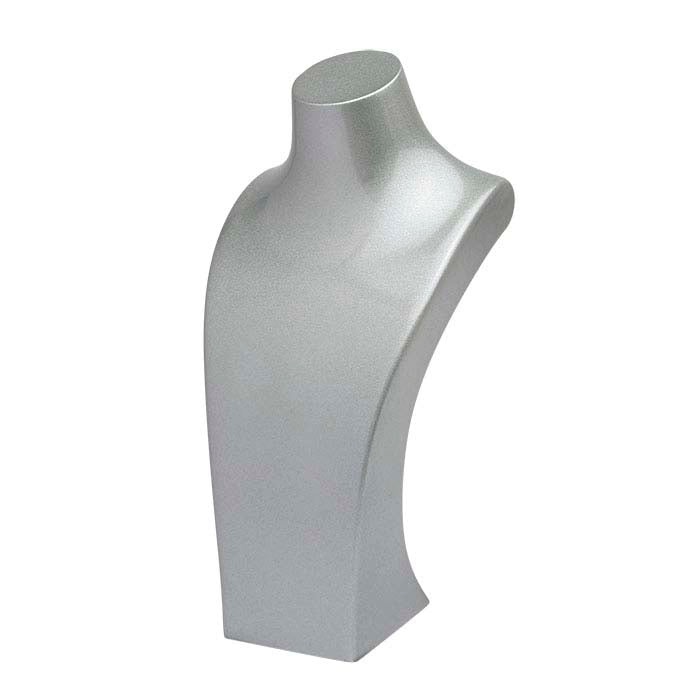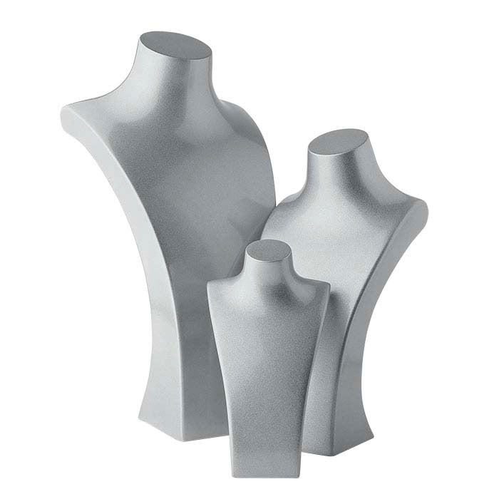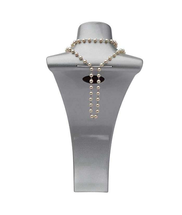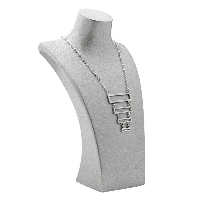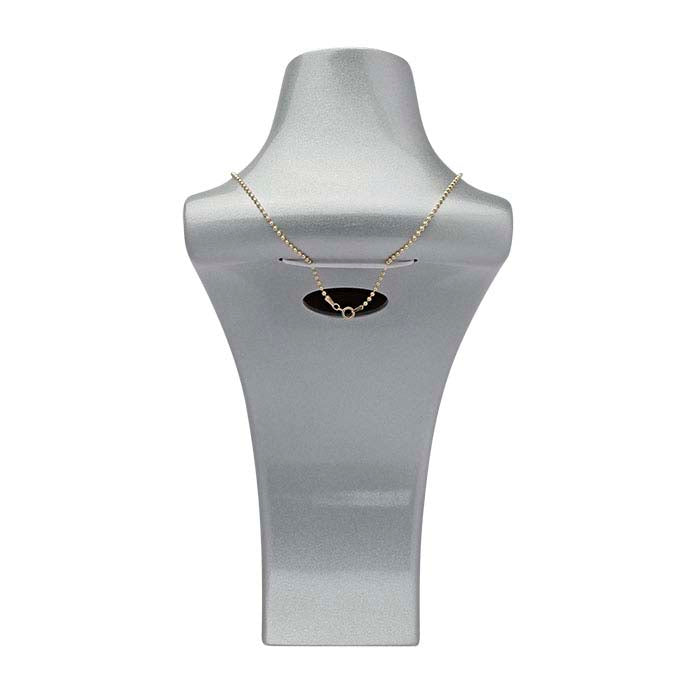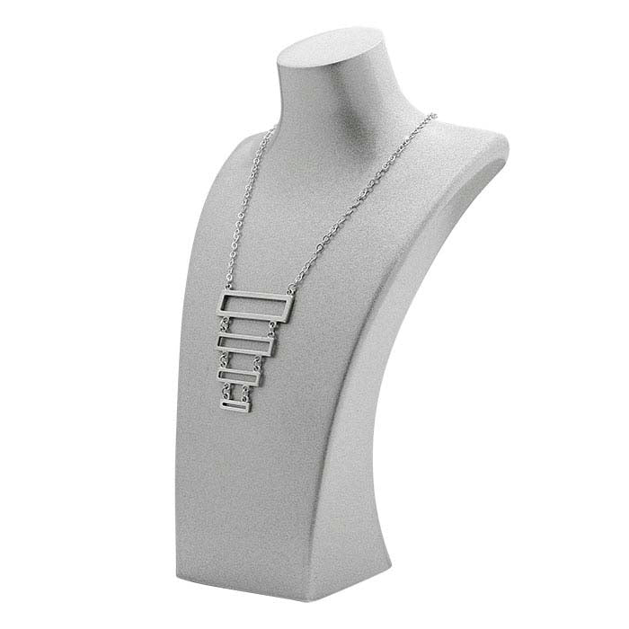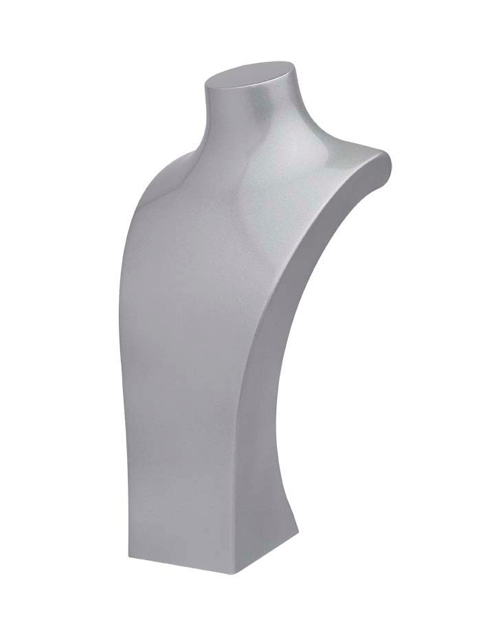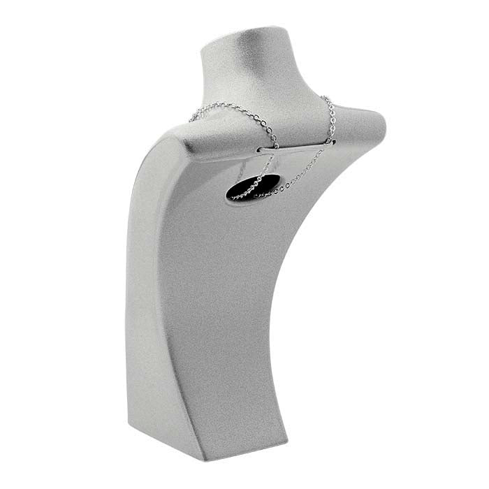 Šis plastikinis kaklo papuošalų stovas pasižymi plonu dizainu ir yra idealus vienam vėriniui ar pakabukui eksponuoti. Stovas turi lygią, blizgią metalinę sidabro spalvą, o kontūras atspindi papuošalą natūralioje padėtyje, kad klientai galėtų matyti, kaip jis atrodys dėvint. Elastinga juosta stovėlio gale leidžia reguliuoti vėrinio ilgį iki idealaus eksponavimo, o ovalus išpjovimas slepia papildomą grandinėlę, užtikrinant tvarkingą ir profesionalų pristatymą.