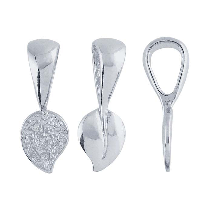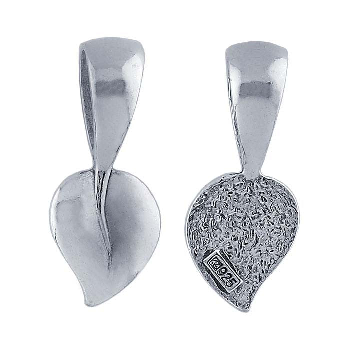 This sterling silver glue-on bail, with its simple and classic leaf design, is the perfect way to show off a glass cabochon and transform it into a wearable pendant. Use jeweler's epoxy to attach the glass to the textured surface of the mounting; the texture strengthens the bond with the epoxy. The simple and elegant leaf on the back gives your pendant 3D appeal. The bail is oxidized to highlight the vein of the leaf.Glue-on bails are an ideal choice for glass or enamel cabochons or flat-back pieces; the bail provides a flat area that accommodates almost any component with a smooth back surface. The back of the bail is usually decorative, offering the option of featuring that side as part of your design, if desired.